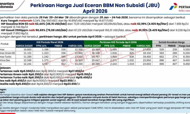 Didalam tabel, tertulis beberapa jenis BBM non subsidi (JBU) diperkirakan akan mengalami kenaikan pada April 2026 mendatang. Parahnya, kanaikan harga itu terbilang cukup signifikan. Seperti BBM Jenis Pertamax diprediksi akan mengalami kenaikan hingga Rp.5.550,- perliter, kemudian Pertamax green akan mengalami kenaikan sebesar Rp.6.250,- perliter. Lalu, Pertamax Turbo akan mengalami kenaikan sebesar Rp.6.350,- perliter, Dex akan naik sebesar Rp.9.450,- perliter, serta Dexlite juga akan mengalami kenaikan sebesar Rp.9.450,- perliter.